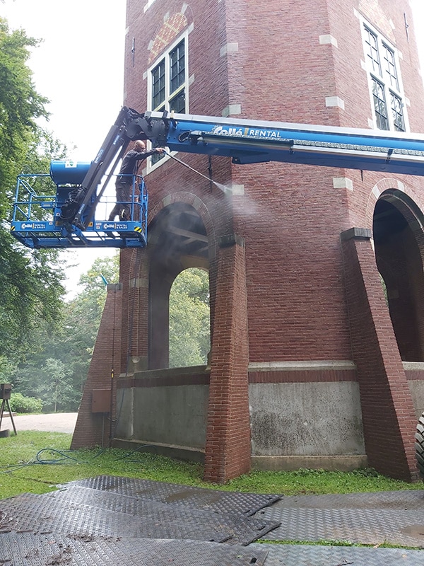 Met behulp van een hoogwerker zijn inspecties en reparaties uitgevoerd aan het voegwerk, en zijn de muurankers waterdicht gemaakt zodat er geen vocht meer kan binnendringen.